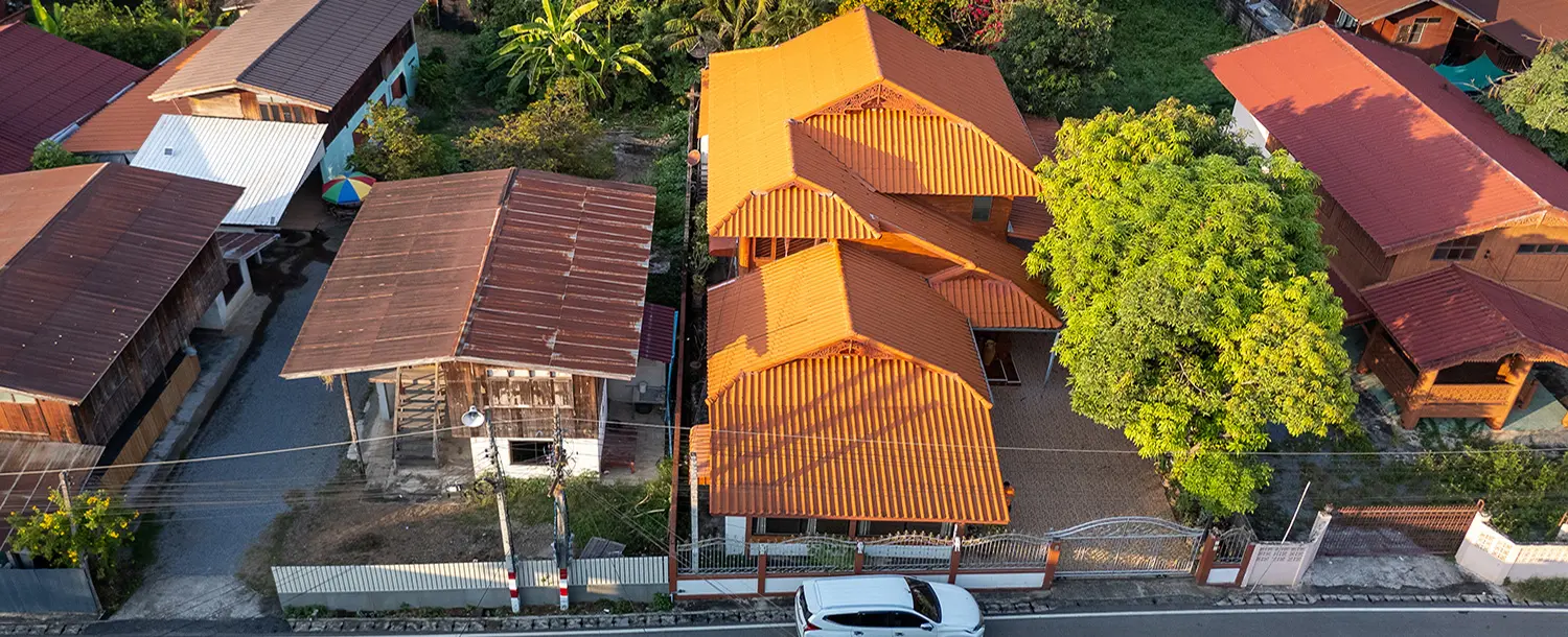 The house is built on a large 180.5 sq wah (722 sq m or 7,772 sq ft) rectangular plot of land, with the house facing the road. It is shaded by many exotic, flowering trees, including coconut palms, bright yellow trumpet flowered shrubs, vibrantly coloured bougainvillea, and mature mango trees which shade and cool the downstairs open area in the summertime.